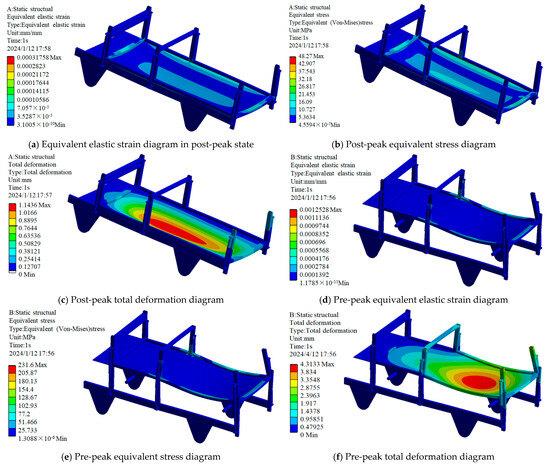 As illustrated in Figure 9, under full-load conditions, the equivalent elastic-strain values for the chassis frame in descending and ascending states (Figure 9a,d) measure 0.000317 and 0.00125, respectively. The maximum equivalent stress (Figure 9b,e), reaching 48.27 MPa and 231.6 MPa respectively, predominantly occurs at the interface region connecting the crossbeam and plate components. Deformation analysis reveals distinct spatial patterns: the maximum displacement in descending state (1.14 mm, Figure 9c) manifests at the central section, while the ascending state’s peak deformation (4.31 mm, Figure 9f) shifts to the middle-rear section. These computational results demonstrate that the chassis configuration satisfactorily meets operational requirements for pineapple field management applications. Notably, the identified stress concentration zones and deformation characteristics provide critical insights for structural reinforcement of vulnerable areas, design optimization strategies, and subsequent lightweight modifications, as referenced in prior research [24].