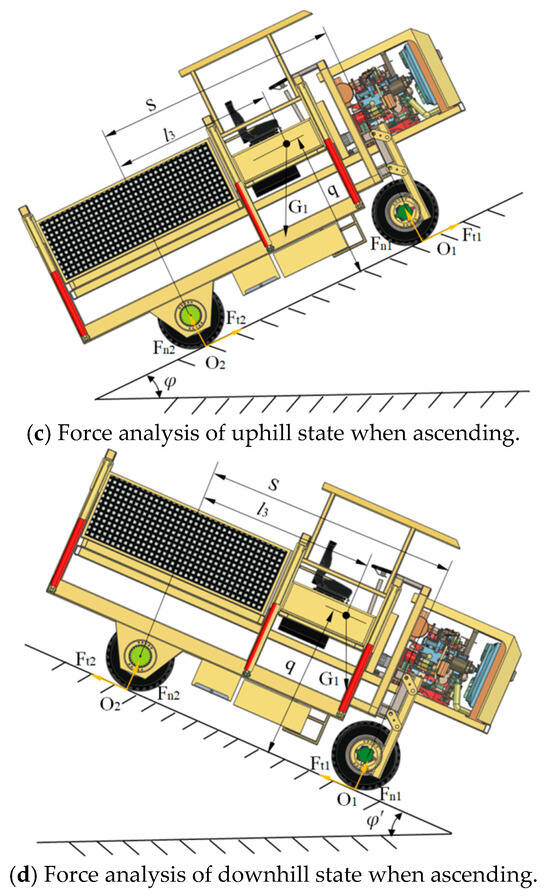 For uphill motion analysis under constant velocity (Figure 10a), we establish the mechanical equilibrium equations formulated in Equation (13), incorporating the following assumptions: negligible air resistance, low-speed operation, and rigid-tire modeling.