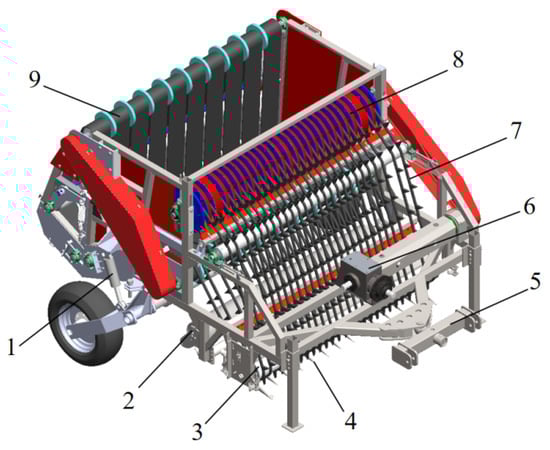 Structural diagram of the belt-tooth type residual film recovery machine. 1. Hydraulic device, 2. Depth-limiting wheel, 3. Packing roller, 4. Film-lifting tooth, 5. Traction frame, 6. Gearbox, 7. Belt, 8. Film removal ring, 9. Packing belt.
