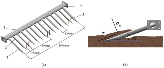 Structure diagram of the film-lifting device. 1. Crossbeam, 2. Standard film-lifting tooth, 3. Edge-film-lifting tooth, 4. Fixing plate, 5. Cotton root stubble. (a) Film-lifting teeth arrangement diagram, (b) Film-lifting teeth force diagram.