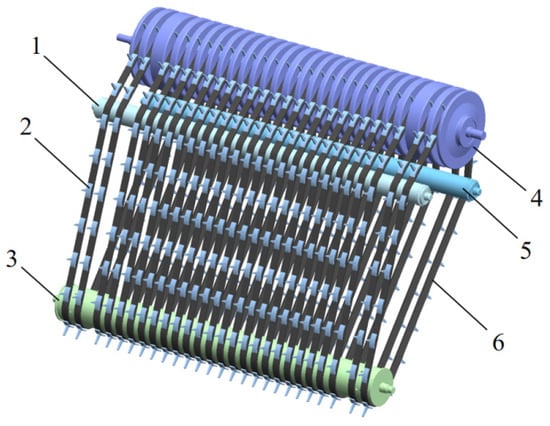 The spring-tooth type and chain-harrow type feature elongated tooth profiles. During the film collection operation, the spring-teeth undergo deformation due to soil resistance. Upon exiting the soil, the elastic potential energy stored in the teeth is released, resulting in a sudden increase in velocity. This rapid motion tends to tear the plastic film into strips, thereby compromising the effectiveness of the collection process [11,12,13,14]. Drum and chain-tooth types generally employ hook-shaped or cylindrical teeth with diameters exceeding 8 mm, reducing deformation. For example, the 11SM-1.5 residual film recovery machine developed by Xinjiang Academy of Agricultural Sciences adopts a drum type pickup device that loosens soil beneath films with lifting teeth before collecting them [15]. However, drum type machines poorly separate films from impurities, resulting in high impurity content in recovered films. Jiang Deli’s team designed a nail-tooth-chain plate type residual film recovery machine, utilizing a friction-driven nail-tooth-chain plate for pickup with overload protection [16]. Gou Haixiao’s team developed a two-order pin-tooth chain plate type residual film recovery machine, incorporating a secondary film-conveying mechanism to reduce impurity content [17]. The chain-tooth residual film recovery machine exhibits relatively better impurity removal performance; however, its chain structure is complex, featuring protruding components such as chain plates and pins, which are prone to entanglement and accumulation of weeds, long stalks, or bundled residual film, leading to blockages. Additionally, the gaps between chain links are susceptible to debris intrusion, accelerating wear, shortening the service life of the chain, and making maintenance difficult. Most existing models integrate straw crushing and returning with film recovery, but no effective machine exists for recovering residual films after straw has already been crushed and returned.