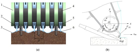 Based on field surveys, the surface height variation in cotton fields ranges from 25–40 mm. Therefore, the penetration depth of the standard film-lifting teeth is set to ≥40 mm, while the edge teeth penetration depth is ≥70 mm. When the teeth penetrate the soil, they exert normal stress (σn) and tangential stress (τ) on the soil (Figure 2b). According to Coulomb’s friction law, the critical slip condition occurs when the tangential stress reaches its maximum value [19]: