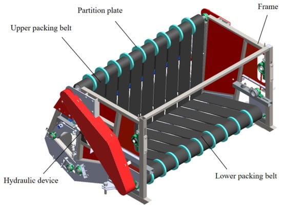 The packing device primarily consists of side panels, a lower packing conveyor belt, an upper packing conveyor belt, a hydraulic device, and a frame. Its structural diagram is shown in Figure 6. The lower and upper conveyor belts are joined at one end, forming a V-shaped internal surface. The packing roller is powered by the tractor’s output shaft via chain transmission. Residual film inherently exhibits adsorption and entanglement properties [26]. After entering the packing box, the residual film is driven by the friction of the lower packing belt to the bottom of the V-shaped section, pressing it against the upper packing belt. The friction between the upper belt and the film provides instantaneous acceleration along the belt surface, causing the film to flip backward. Repeating this process forms an initial core of the film bundle. As residual film continuously enters the packing box, the bundle diameter increases, achieving the film-rolling and bundling effect. After completing the film collection, the hydraulic device lifts the upper packing belt to open the film box for discharge.