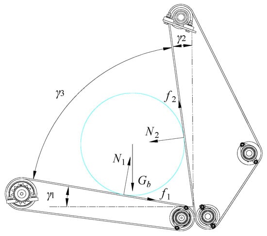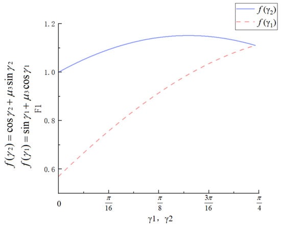 The static friction coefficient μ3 between the packing belts and the residual film is measured to be approximately 0.572. When N1 and N2 increase, f1 and f2 also increase, facilitating the formation of a compact film bundle. To ensure sufficient space inside the film box, γ3 is set to 45°, with γ1 + γ2 = 45°. To determine the values of γ1 and γ2, function plots were generated for the non-constant terms in the numerator of Equations (16) and (17), as shown in Figure 8. As shown in Figure 8, N1 first increases and then decreases with γ2, remaining in the increasing phase when γ2 is less than 22.5°. N2 increases with the rise in γ1. To maximize both N1 and N2 within the allowable range, and taking into account the effective impurity-leakage length of the lower packing belt, both γ1 and γ2 are set to 22.5°.