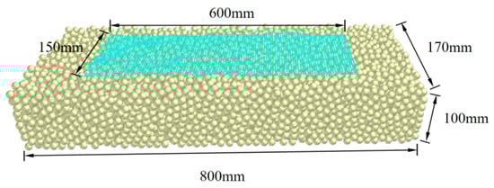 Given the ductility and flexibility of the residual film, the Hertz–Mindlin with bonding contact model was applied for film–film interactions. Soil particles were modeled as spheres with a radius of 4 mm. Due to the presence of moisture capillary forces and van der Waals forces between soil particles, cohesive effects needed to be simulated, and thus the Hertz–Mindlin with JKR model was used for soil–soil interactions. To accurately simulate the adhesion behavior of soil particles on the surface of the residual film, the Hertz–Mindlin (no slip) model was applied for soil–film interactions. The nail-tooth material was set as high-manganese steel. Given the adhesive properties of the residual film, the Hertz–Mindlin with JKR model was used for nail-tooth–film interactions, while the Hertz–Mindlin (no slip) model was applied for nail-tooth–soil interactions to ensure complete transmission of tangential forces during soil shearing resistance when the nail-tooth penetrates the soil. Relevant material and contact parameters were obtained from previous measurement studies and references [29,30,31,32], as detailed in Table 2.