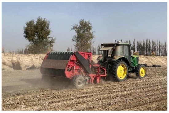 - Liu, X.F.; Shi, X.; Guo, Z.F.; Wang, C.Y.; Wang, X.N. Performance test on roller type residual film recycling machine. Trans. Chin. Soc. Agric. Eng. (Trans. CSAE) 2017, 33, 26–31, (In Chinese with English abstract). [Google Scholar] [CrossRef]