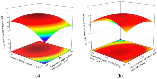Response surface of interactive factors affecting residual film recovery rate. (a) Effects of machine forward speed and penetration depth of film-lifting teeth on residual film recovery rate, (b) Effects of penetration depth of film-lifting teeth and angle of pickup belt relative to horizontal plane on residual film recovery rate. Note: Darker red areas in the diagram indicate higher residual film recovery rates.
