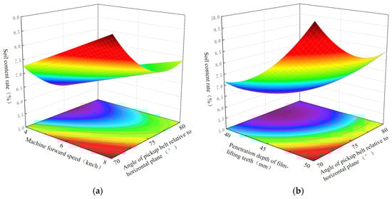 Response surface of interactive factors affecting soil content rate. (a) Effects of machine forward speed and angle of pickup belt relative to horizontal plane on soil content rate, (b) Effects of penetration depth of film-lifting teeth and angle of pickup belt relative to horizontal plane on soil content rate. Note: Increasingly purplish areas represent lower soil content rates.