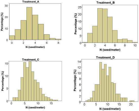 In the K–S test, the p-value is defined as the probability of observing the current D-value under the condition that the null Hypothesis H0-2 holds. When the H value is 1, it indicates that the corresponding p ≤ α, and the null Hypothesis H0-2 is rejected. When the H value is 0, it means that the corresponding p ≥ α, and the null Hypothesis H0-2 is accepted [22]. That is to say, the hypothesis that the sample data of seeds per meter from different experimental groups, respectively, follow Poisson distributions with different parameters λ is valid.