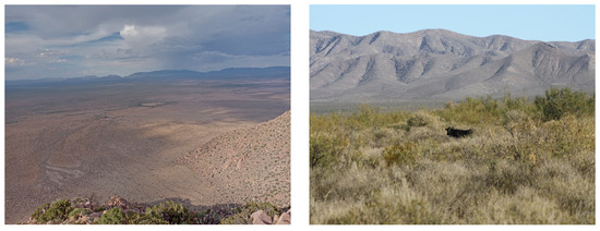The CDRRC spans approximately 64,000 acres across the Jornada del Muerto Basin at the northern edge of the Chihuahuan Desert ecoregion. The terrain is predominantly flat, with an average elevation of 4000 feet [17]. The climate is characteristic of hot desert regions. The average annual precipitation is 247 mm, with more than half typically falling between July and September. Mean ambient temperatures peak in June at approximately 36.0 °C and reach their lowest in January, averaging around 13.3 °C. The vegetation at the CDRRC is dominated by honey mesquite (Prosopis glandulosa Torr.) interspersed with native grasses, including black grama (Bouteloua eriopoda), dropseeds (Sporobolus spp.), and threeawns (Aristida spp.). The CDRRC has a rich and diverse wildlife population. Mountain lions, coyotes, oryx, and mule deer are sighted regularly at the site [17]. Figure 1 depicts the landscape and typical shrubland and grassland plant communities at CDRRC.