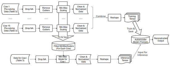 The trained autoencoder was intended to capture the regular behavior of cows before calving. To use the autoencoder for predictions, additional processing steps of the input data were required. These processing steps (bottom box in Figure 3) uses the previously processed data show in Table 3. The input data includes both pre-calving- and calving-related data. In a following step, data were cleaned and normalized. The normalization was applied using the Min–Max scalers learned previously from the pre-calving data, ensuring the consistent normalization of all data. Finally, because calving events are abnormal events, the “Remove outliers” step was not utilized (Figure 3). Similar to the training data, the testing data needs to be processed to the same format before it is fed into the model. Therefore, the format of the testing data was the same as the training data described before.