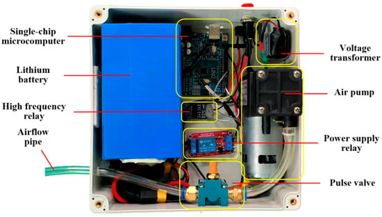 In order to achieve effective tomato pollination with pulse airflow, an electronic tomato pollination device was designed. It can generate pulsed airflow to achieve non-contact tomato pollination, as shown in Figure 2, which has a size of 250 mm × 150 mm × 100 mm, and a weight of 1.5 kg. It has the advantages of a simple structure and compactness, which make it suitable for non-contact pollination operations of facility tomatoes.