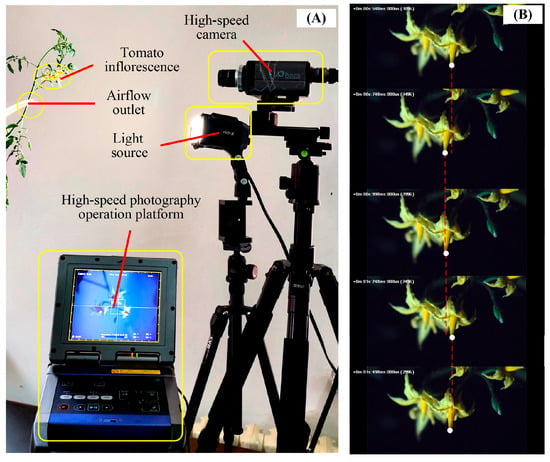 High-speed photography system and tomato flower motion trajectory under pulse airflow. (A) High-speed camera system. (B) Tomato flower positions and displacements under pulse airflow.