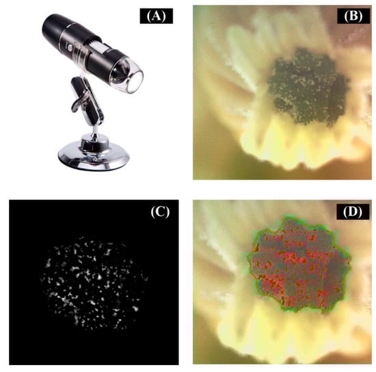 Identification of pollen coverage on tomato stigma based on image-processing method. (A) Electronic micro-camera. (B) Original image acquired with a micro-camera with a magnification factor of 200 times. (C) Enhanced stigma regions with pollen particles. (D) Recognition results of pollen particles: number and coverage.