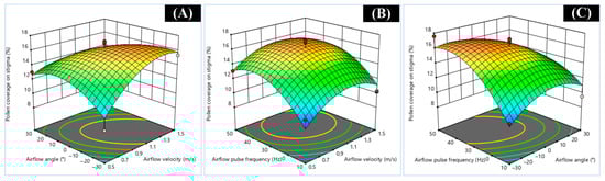 Response surface curves of airflow velocity, angle and pulse frequency for pollen coverage on stigma. (A) The response surface curve of airflow velocity and angle. (B) The response surface curve of airflow velocity and pulse frequency. (C) The response surface curve of airflow angle and pulse frequency.