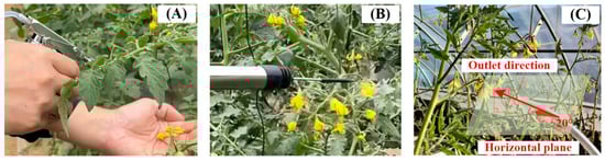 The third group is the vibration pollination group, which uses a specialized electric vibrating pollinator (CS-88, Guangzhou Lvbang Landscape Machinery Co., Ltd., Shenzhen, China) to achieve supplementary pollination for tomatoes. When the electric vibrating pollinator is working, the vibration rod will contact the inflorescence, driving the tomato flowers to shake and achieve assisted fruit setting, as shown in Figure 6B.