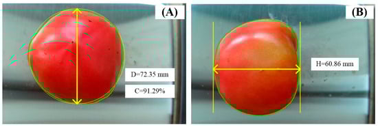 When conducting the image processing operation for tomato shape characteristics recognition, images of tomatoes in the top and side views were collected, and we extracted the contour lines of tomatoes in two different directions. We fitted the tomato contour in the top view to obtain the circularity C of the tomato fruit. At the same time, a circle was fitted based on the tomato contour, of which the diameter is taken as the fruit diameter D, as shown in Figure 7A. Then, we calculated the difference in the horizontal axis of the contour in the side view direction as the fruit height H, as shown in Figure 7B.