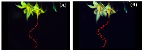 To compare the tomato flower motion characteristics and trajectories under the action of pulse airflow and stable airflow, the high-speed photography system shown in Figure 3 was used to capture the movement process of one tomato inflorescence under different types of airflow. In order to observe the motion trajectories of the tomato flower more clearly, this study increased the horizontal coordinates of the trajectory by three times and elongated the trajectories vertically to suit the image size, as shown in Figure 8. It can be seen that under the action of stable airflow, the trajectory of tomato flowers is close to a stable reciprocating motion, as shown in Figure 8A. Under the action of pulsed airflow, the motion trajectory of the tomato flower is near to a composite reciprocating vibration that is relatively regular, as shown in Figure 8B.