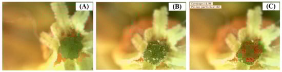 Figure 9 shows the coverage of stigma pollen and identification results before and after pollination of the same tomato flower. From Figure 9A, it can be visually observed that the tomato flower did not have any pollen particles deposited on its stigma before being subjected to pulsed airflow. There was significant pollen deposition after being pollinated by pulsed airflow, as shown in Figure 9B,C. The pollen coverage is relatively uniform, which will greatly increase the possibility of successful pollination of tomatoes and have a certain effect on improving the quality and yield of tomatoes [].