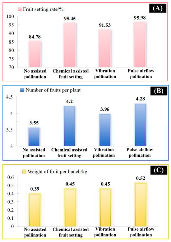 This study separately analyzed the fruit setting rate, number of fruits per plant, and weight of fruit per bunch with different assisted fruit setting methods; the results are shown in Figure 10.