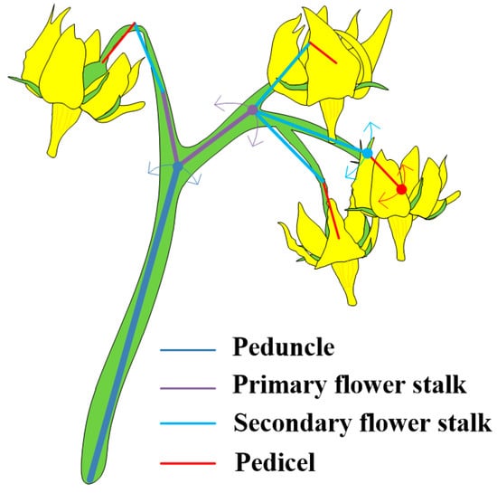 In the authors’ previous research, the tomato inflorescence structural skeleton was divided into four parts, which were peduncle, primary flower stalk, secondary flower stalk, and pedicel []. The elastic coefficients of tomato inflorescence four key structures were measured, and a simplified mechanical model of tomato inflorescence was established, as shown in Figure 11.