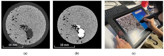 The processing procedure was as follows. First, using ImageJ software, the regions in the cross-sectional image of the uppermost layer that were judged to be plant roots based on their shape were manually filled with a brightness value of 255. The filling process was performed using a pen-display tablet (XP-Pen Artist 15.6 Pro, Hanvon Ugee Technology Co., Shenzhen, China). Figure 1 shows the uppermost layer images before and after filling as well as the procedure. Next, the threshold corresponding to the filled voxels in the uppermost layer was determined. This threshold was fixed and consistently applied to all subsequent layers. The extraction of the plant roots from the second layer onward was automatically performed using a program written in Python 3.12.7. An overview of the automatic plant root extraction program for layers beyond the second layer is shown in Figure 2.