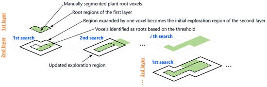 Plant roots grow underground while branching out from the seed. Based on this, the concept of region growing [] is sometimes used for root segmentation [], where root regions progressively change as they extend downward from the stem at the surface. We considered that this region growing approach offers a relatively simple and suitable framework for the method we intend to establish. From the surface layer images, the roots immediately beneath the stem were extracted based on their shape characteristics. For the next layer, new regions were defined by identifying the voxels with brightness values similar to those of the surface roots within the vicinity of the regions detected in the previous layer. By sequentially repeating this process down to the lowest layer, we aimed to extract the entire root system.