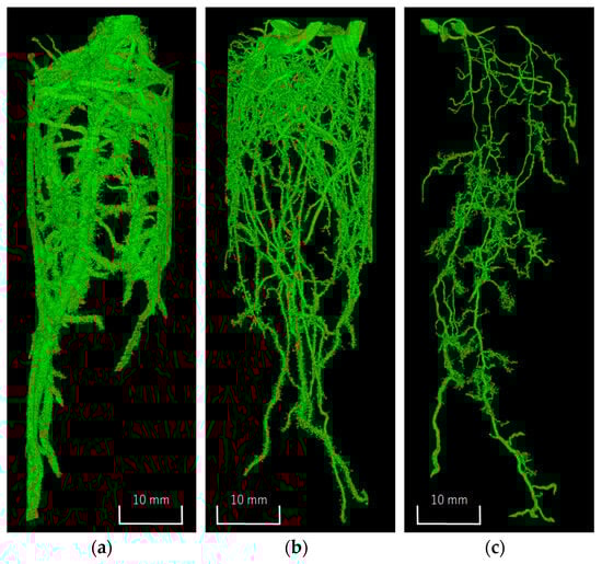 Three-dimensional images of the segmented plant roots: (a) soybean; (b) Italian ryegrass; (c) Guinea grass.