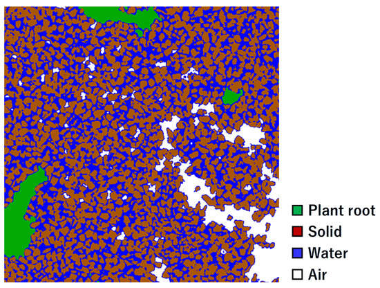 In addition to the plant roots, segmented images of the soil components were generated. As an example, the segmented image for the soybeans is shown in Figure 4, and the volumetric proportions of each constituent obtained from the segmentation of the soil cultivated with different plants are presented in Table 1. The volumetric fraction of the soil particles can be estimated by dividing the bulk density of the Toyoura sand (approximately 1500 kg m−3) by the density of quartz, which is considered to be the main component (2660 kg m−3) []. The calculated volumetric fraction of the soil particles was 56%, which was generally consistent with the results obtained from the present analysis. Through this segmentation, the plant roots, soil particles, water, and air were successfully distinguished. These segmented images facilitated the analysis of the impact of the plant roots on the soil structure.
