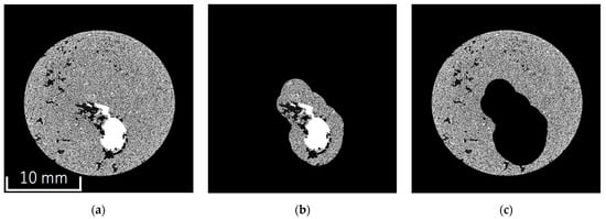 The acrylic column was removed using an approach proposed by Phalempin et al. []. Owing to the slight tilt of the column, the center coordinates and radius of the soil column varied across the cross-sectional images, necessitating removal on a per-image basis. The center coordinates and radii were manually determined from the topmost and bottommost cross-sectional images. Assuming a linear change in the center of the column and a radius with the height owing to the tilt, the center coordinates and inner diameter for all cross-sectional images were calculated through linear interpolation based on the values from the topmost and bottommost images. Using the distribution of the center coordinates and inner diameters derived from the linear correction, the soil portion within the acrylic column was extracted as the region of interest, whereas all other regions were set to a brightness of zero.
