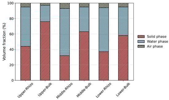 Three-phase distribution of rhizosphere and bulk soil at each depth. In the horizontal axis, “Upper,” “Middle,” and “Lower” indicate the upper, middle, and lower soil layers, respectively, while “Rhizo” and “Bulk” represent the rhizosphere and bulk soil.