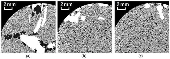 In recent years, X-ray computed tomography (CT) has gained attention for the analysis of soil structure and fluid movement at the microscale [,]. With a resolution ranging from several tens to several hundreds of micrometers, X-ray CT enables the identification of distinct soil particles, pore water, and pore air, particularly in soil with relatively coarse particles []. Furthermore, attempts have been made to estimate hydraulic conductivity and gas transport properties based on the volume fraction, size distribution, and connectivity of each soil component obtained from X-ray CT [,]. X-ray CT has also emerged as a powerful alternative for observing plant roots in soil, offering a non-destructive solution compared to traditional methods, such as excavation [] and two-dimensional observations with rhizoboxes []. In other words, X-ray CT has the potential to segment plant roots and other soil components, enabling the evaluation of plant root effects on the soil particle arrangement and pore structure.