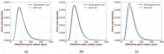 Pore size distributions of rhizosphere and bulk soil: (a) upper layer; (b) middle layer; (c) lower layer.