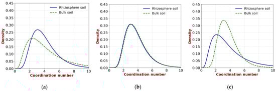 Pore-water coordination numbers of rhizosphere and bulk soil: (a) upper layer; (b) middle layer; (c) lower layer.