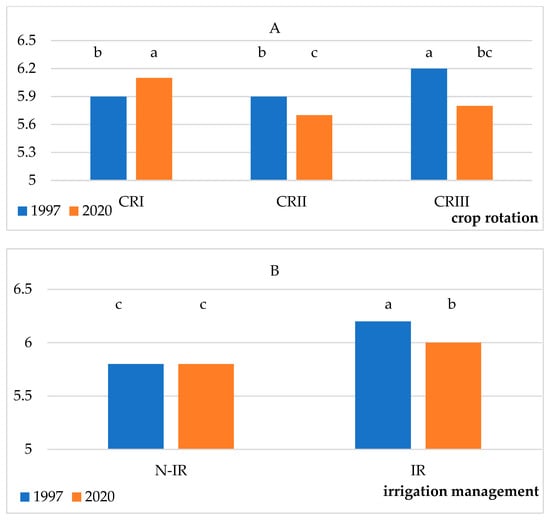 | Year of Experiment | CR/% Share of Cereals | Non-Irrigated (N-IR) | Irrigated (IR) | Mean for Crop Rotation |