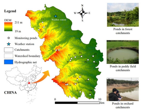 Ponds are miniature aquatic systems that receive runoff from the catchment, and they have excellent effects on flood control and agricultural irrigation [16]. While some studies have explored the retention effects of urban detention ponds on N loads during rainfall events [17,18], limited attention has been given to the influence of catchment characteristics, especially for ponds in agricultural catchments. Tens of thousands of ponds are scattered throughout the subtropical regions of China, where their water quality is heavily influenced by agricultural activities and rainfall patterns [5,19]. This study focused on ponds located in agricultural catchments dominated by paddy fields and orchards, using forested catchments as a control, to investigate dynamics in N concentrations and loads following rainfall events. The specific objectives included (1) stating the changes in pond water depth pre- and post-rain, (2) analyzing the variations in N concentrations and N loads in ponds across different rainfall intensities, and (3) establishing pathways linking rainfall amounts and catchment characteristics to N changes. This study links hydrological responses to catchment characteristics, attempting to provide actionable insights for reducing N pollution while promoting sustainable agricultural development in China’s pond-dense subtropical regions.