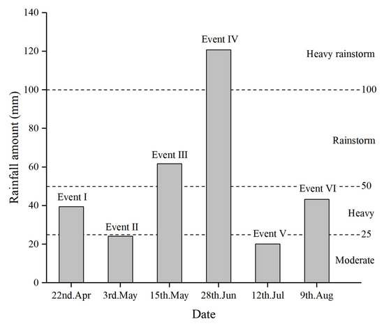 Light rainfall is typically absorbed and retained by the soil, making runoff generation unlikely [21]. This study conducted sampling activities following the moderate or higher rainfall intensity events to ensure runoff export. Six rainfall events were monitored from April to August (Figure 2), classified into two moderate rains (Event II (24.50 mm) and V (20.10 mm)), two heavy rains (Event I (39.50 mm) and VI (43.30 mm)), one rainstorm (Event III (61.70 mm)), and one heavy rainstorm (Event IV (120.80 mm)) according to national rainfall intensity standards (GB/T 28592-2012) [22]. Given the maximum straight-line distance of 18 km between the farthest monitoring ponds, the spatial variation in rainfall was considered negligible in this study.