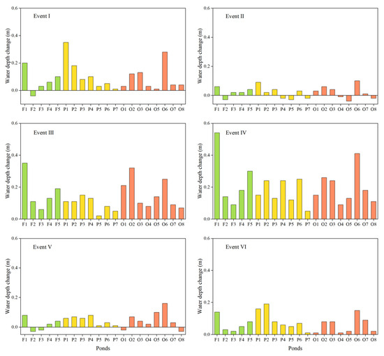 Following Event V, four ponds (F2, F3, O1, and O8) exhibited a decrease in post-rain water depth, while pond O6 showed the greatest increase, rising by 0.16 m. In paddy field catchments, post-rain water depths increased by 0.01–0.08 m, with an average increase of 0.05 m. After Event VI, ponds P7, O1, and O4 had the lowest increases, and pond F3, which had the lowest increase in forest catchments, showed a change that was double that of these ponds. In contrast, Pond P2 exhibited the largest increase in depth post-rain, rising by 0.19 m and showing the highest variability among all ponds. Overall, water depth declines post-rain mainly occurred after the moderate rain conditions of Events II and V, while the most pronounced increases occurred following the rainstorm of Event IV.