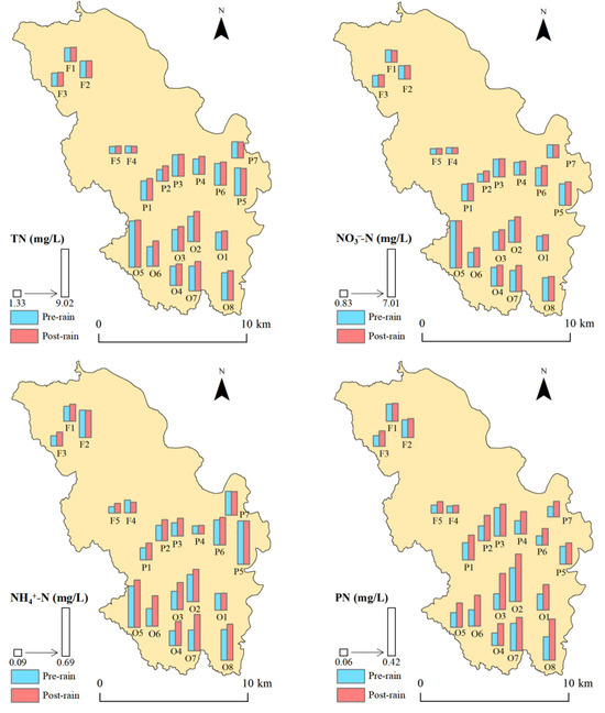 The variability in pond N concentration was ranked as follows: forest catchments < paddy field catchments < orchard catchments (Figure 4). TN concentrations in orchard catchment ponds ranged from 3.43 to 9.02 mg/L, with an average of 1.36 times higher than that in paddy field catchment ponds and 2.27 times higher than that in forest catchment ponds. During the entire monitoring period, NO3−-N remained the main N form, accounting for over 50% of TN concentrations. After the rainfall events, TN concentrations in eight orchard catchment ponds increased by 2.15–29.48%. NO3−-N concentrations in ponds F1, P7, and O5, as well as NH4+-N concentrations in ponds F2, F4, P5, and P7, showed slight declines. The average NH4+-N concentrations in orchard catchment ponds increased by 38.46%. PN concentrations were most affected by rainfall events, with increases of 22.59, 49.92, and 69.21% in forest, paddy field, and orchard catchment ponds, respectively.