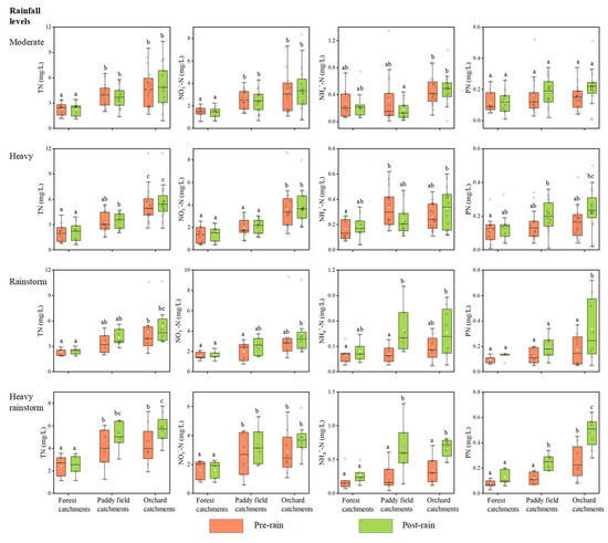 Pre- and post-rain N concentrations in forest, paddy field, and orchard catchment ponds. Different letters indicate significance at the p < 0.05 level. The triangle symbols in the box plots represent the mean values.