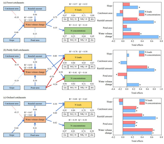The model results clearly showed the differences in the changes in pond N among these catchments’ response to rainfall events and the main influencing factors. Positive Q2 values indicated that the combined effects of rainfall and catchment characteristics reliably explained the variations in pond N dynamics, while R2 results suggested that predictive factors explained N loads better than concentrations (Figure 6). The lower R2 of N concentrations may be related to the high variability of concentration. In forest catchments, rainfall amount and catchment characteristics indirectly affected pond N concentrations and loads through water volume changes, without direct effects (Figure 6a). Slope and rainfall amount significantly increased pond water volume, with path coefficients of 0.40 and 0.84, respectively. Water volume change had significant path coefficients of 0.35 for N concentrations and 0.75 for N loads. The total effect suggested that rainfall amount and the increase in water volume due to rainfall events were the main factors contributing to increased N concentrations and loads. In addition, catchments with steep slopes significantly elevated pond N loads.