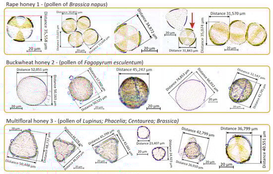 The study included 3 varieties of nectar honeys produced by Apis mellifera species obtained in the months of June, July and August from an apiary located in the area of Wielkopolska, Poland. The honeys were identified by pollen analysis as rape (honey 1—June), multifloral (honey 2—July) and buckwheat honeys (honey 3—August). Pollen analysis was carried out according to the method presented by Pospiech et al. [23] and the Regulation of the Polish Minister of Agriculture and Rural Development [24], which involves microscopic examination of fixed preparations of pollen grains obtained by centrifugation of aqueous honey solutions. The preparations were observed using a Zeiss Axipolar microscope (Carl Zeiss AG, Oberkochen, Germany), counting at least 300 pollen grains for each honey while determining their species based on the database at www.paldat.org [25] and the flowering period in Poland. Based on the percentage of one pollen grain in the analyzed sample of 300 pollen, the following categories were determined: dominant pollen (D) > 45%, secondary pollen (S) 16–45%, tertiary pollen (M) 3–15% and trace pollen (T) < 3%. From a palynological point of view, honey that contains the dominant pollen type (>45% of total pollen) is considered monofloral. Meanwhile, when honey contains different types of pollen and lacks dominant pollen (<45%), it is considered multifloral [26]. Based on the study, the honeys studied were of the following varieties: rape (98% of rape dominant pollen), buckwheat (77% of buckwheat dominant pollen) and multifloral (diversity of pollen grains with secondary lupine pollen grains at 7%), (Figure 1).
