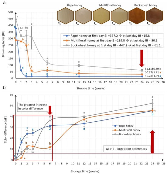 Changes in the color attributes of different botanical origin honeys stored at a temperature of 8 ± 1 °C: (a) browning index (BI); (b) color difference (ΔE), where tx is a time of storage: t0: zero days of storage; t24: 24 weeks of storage. a–f Different superscript letters denote significant differences (HSD Tukey’s test, p < 0.05).
