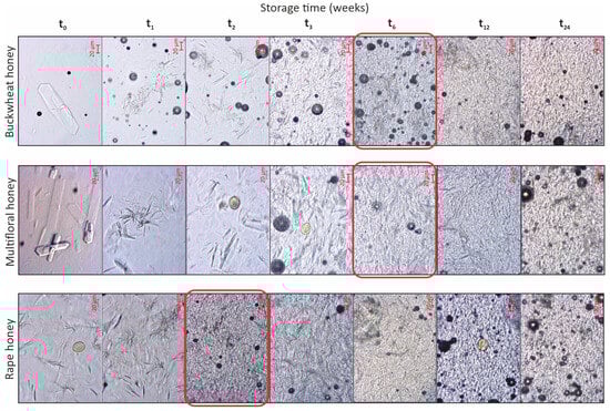 Pollen grains, air bubbles and single crystalline embryos were present in liquid honeys immediately after collection (t0). It was observed that there were significantly more crystal embryos in rapeseed honey than in the other honeys, and they were characterized by a fine, oval shape. Multiflower honey, on the other hand, had an irregular crystal structure, while buckwheat honey contained mainly large, flat crystals, which is in line with the study of Bakier et al. [2]. It was observed that during the storage of the honeys, there was an increase in the number of crystals and that they formed characteristic crystal structures (clusters). Differences in the analyzed image for individual honeys can be seen as early as the second week of storage (t2). At this time, a lot of small and densely packed crystals are visible in rapeseed honey, while in multiflower and buckwheat honeys, single crystals and their small aggregates, unevenly distributed in the examined sample, are still observed. Only in the following weeks at t3 and t6, a thickening of crystal structures is observed in multiflower and buckwheat honeys, leading to the filling of voids in the field of vision. From this point on, no more significant changes are observed in the crystallization structure of the honeys. It can therefore be assumed that after this storage time, it is preferable to cream the honey. Similar observations were made by Ji et al. [19], who additionally showed that honey stored at higher temperatures (including 17 °C) crystallizes more slowly than honey stored at 11 °C and 14 °C. The authors showed that the crystal structures that form in honeys stored at 17 °C after 90 days (about 13 weeks) are sparsely arranged and characterized by an elongated shape, while in honeys stored under refrigeration conditions, the crystals are smaller and densely arranged. The observed changes in the honeys are also consistent with the reports of Bakier [12] and Dettori et al. [4], who in their work pointed out the characteristic two phases of the crystallization of honeys. The first is the so-called incubation phase, in which crystalline embryos are formed in the form of thin, elongated plates. The speed of this phase depends on the honey variety, and the result is a slight turbidity of the honey. The second phase of crystallization is the lamellar phase, characterized by a rapid increase in the number of crystals and the formation of crystal agglomerates, resulting in changes in the texture, viscosity and sensory characteristics of the honeys (color). This phase proceeds very slowly until an equilibrium between the crystalline and liquid phases is formed in the honey.