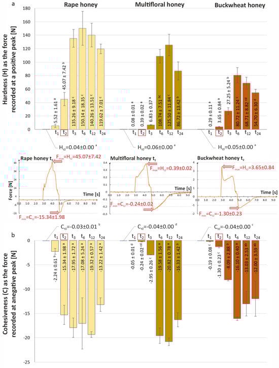 The observed changes in the crystallization of the honeys are reflected in the changes in their hardness, cohesion and viscosity (Figure 4a,b and Figure 5) and are consistent with the studies of other authors [19].