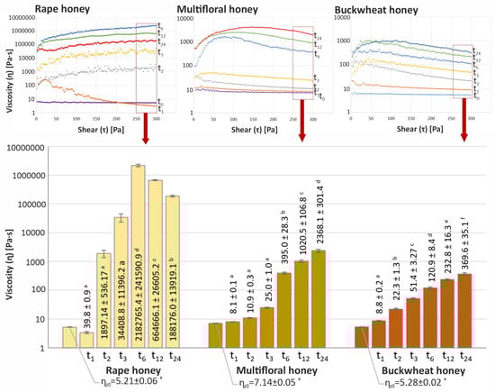 Average viscosity value (η) of rapeseed honey; multiflower honey; and buckwheat honey in individual weeks of their storage at 8 ± 1 °C and 73 ± 2% humidity measured for shear of 300 Pa where tx is a time of storage: t0: zero days of storage; t1: 1 week of storage; t2: 2 weeks of storage; t3: 3 weeks of storage; t6: 6 weeks of storage; t12: 12 weeks of storage; t24: 24 weeks of storage. a–f Different superscript letters denote significant differences (HSD Tukey’s test, p < 0.05).