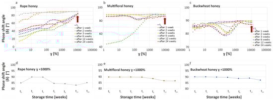 Changes in the phase angle values (δ) of the tested honeys in individual weeks of storage at 8 ± 1 °C and 73 ± 2% humidity conditions: (a,d) rape; (b,e) multifloral; (c,f) buckwheat.