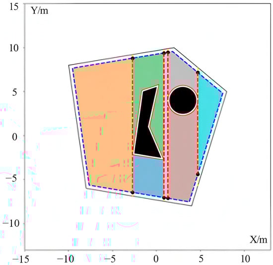 Among field partitioning methods, the trapezoidal decomposition approach is commonly adopted, as illustrated in Figure 2. Its core idea is to use a vertically moving sweep line from left to right, triggering three types of events upon intersecting obstacle vertices: an IN event indicates entry into an obstacle and splits the area into two sub-regions, a MIDDLE event indicates crossing the middle of an obstacle and generates one sub-region, and an OUT event indicates leaving the obstacle and reduces the number of active regions. By continuously handling these events, the original region can be decomposed into multiple regular and obstacle-free trapezoidal cells [35], which facilitates the subsequent path planning.