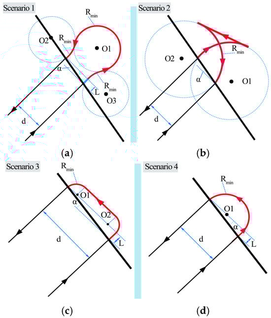 Once the turning direction at the end of each path segment is determined, the next step is to specify the corresponding turning strategy. Fish-tail turns, teardrop turns, semi-circular turns, and arc-shaped turns are among the most commonly used maneuvers in agricultural operations. Referring to the agricultural turning path planning method proposed by Wang Meng and considering the minimum turning radius of the machine , the angle between the field boundary and the perpendicular to the working line at the headland, as well as the working width , the characteristics of the four turning types are illustrated in Figure 5.