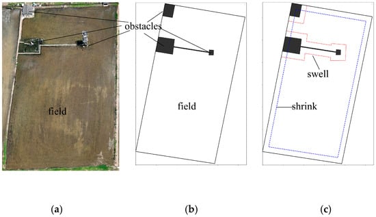 To accommodate GNSS positioning errors and ensure sufficient clearance for agricultural machinery, a fixed-width safety buffer is applied around both field boundaries and obstacles. The entire working area is denoted as a polygon , with obstacles represented by the set and the target subregions by . Using morphological dilation, the expanded unsafe zone is constructed as